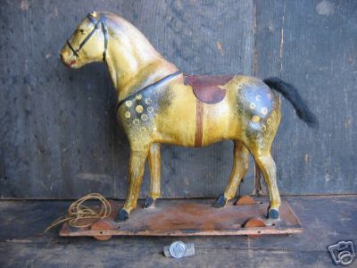 Uncle Sandy was telling me what when he was young kids didn't ask for toy cars, they asked for horses. He was very young only 3 or 4 years old (we know this because his Grandmother Josephine Toeppner died in 1934) he got up one Christmas morning and found a white toy horse tied to the leg of the side table in the kitchen. It had reins and someone had put a little hay in front of it. He remembers his Grandmother saying the horse's name was Schimmel, which is German for white horse. Uncle said it had wheels on it, but doesn't remember much else about it. I found this picture on the Internet, not sure if it was exactly like this or not.